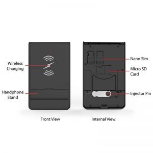 Credit card size, 10W fast charging, sim card+memorycard+injector pin storage, handphone stand, power with any USB cables