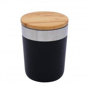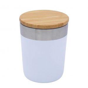 The vacuum coffee tumbler with bamboo lid features durable, stainless steel vacuum construction is designed to prevent condensation on the outside of the tumbler. This tumbler body features an on-trend, durable powder coated finish with a natural bamboo press-on lid. Keep bamboo lid dry when not in use.
