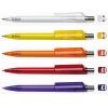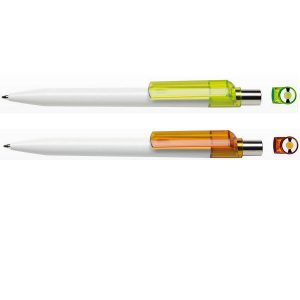 ABS plastic, glossy finishes, solid white barrel, transparent colours clip, chromed push-button, solid colours little sphere in the push-button