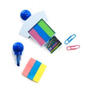 With highlighter and paper clips. Included 3 colours notepad, 20 sheets per colour.